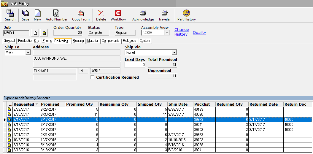 It would be helpful to be able to see the quantity of parts returned by a customer in the Total Promised field. In the example, 31 pieces were shipped. However, the customer returned 11 pieces, which were reworked and shipped back. When they were shipped back to the customer, the Total Promised kept increasing. It now shows that 31 pieces have been delivered, when the true quantity shipped is only 20.